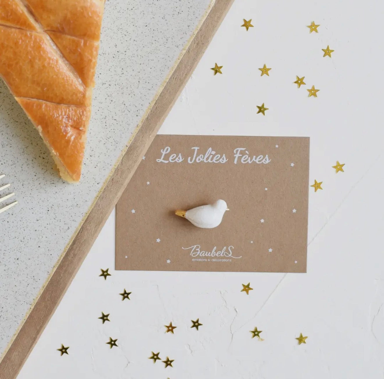 Packaging : fève positionnée par un point de colle alimentaire sur un carton décoré.