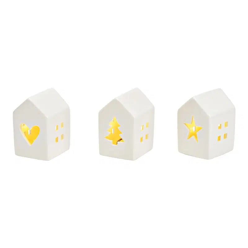 Ces trois petites maisons en porcelaine blanche diffusent une douce lumière grâce à leur éclairage LED.