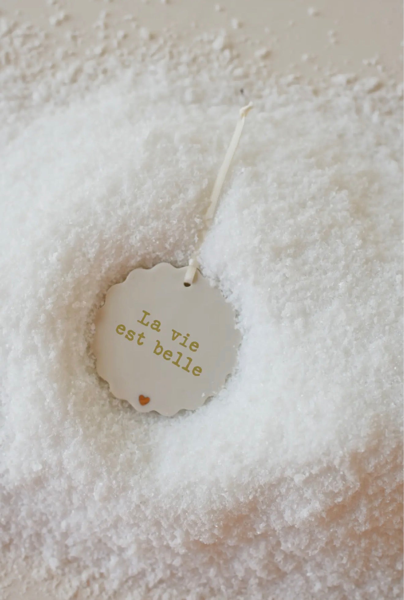 Dans une forme élégante de "biscuit", ce médaillon est décoré d'un petit coeur doré, pour une touche de romantisme. Nos médaillons en porcelaine blanche sont ornés d'un beau message « La vie est belle » dans une police d'écriture effet machine à écrire en sérigraphie dorée.